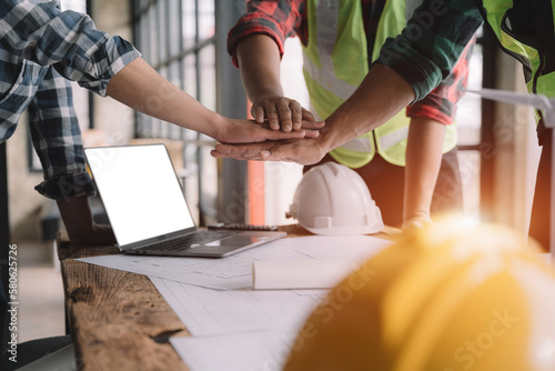 Team architects workers join hands to join forces to join forces to work for the industry for success. Teamwork and professional colleagues : Workers' hands, teamwork concept.