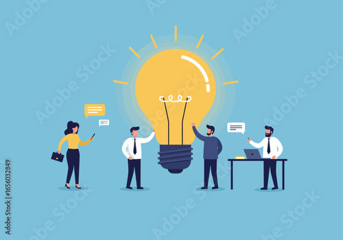 Team brainstorming innovative ideas, large lightbulb symbolizes creativity and collaboration.
