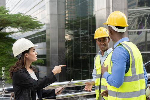 Team builder have problem and angry. Group of Engineer Worker Wearing Safety Uniform and Hard Hat. An angry female boss manager.