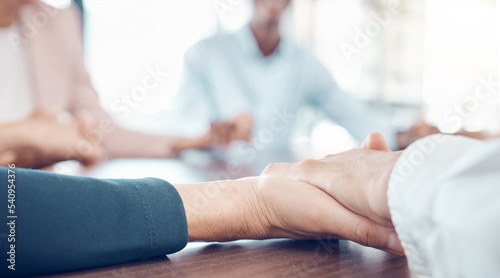 Team building, motivation and business people holding hands in a meeting for communication, trust and support at work. Hands of employees in a seminar for a team goal, mission and community in office