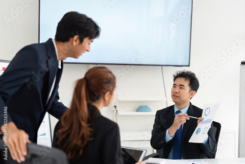 Team Collaboration and Presentation. Professionals engaging in a productive meeting to review project analytics and strategies.