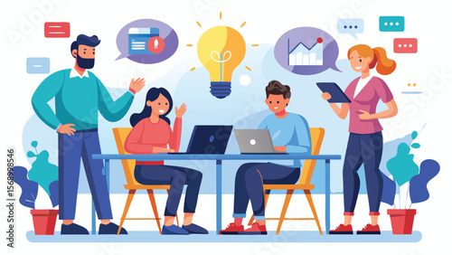 Team collaboration with laptops and tablet around a table with a lightbulb above their heads idea concept