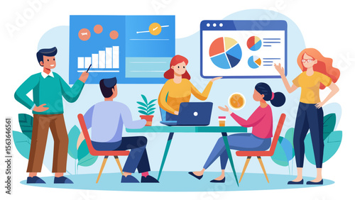 Team evaluating marketing performance result illustration for modern business and teamwork