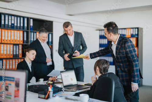 Team members discussing documents and data during a collaborative meeting in an office