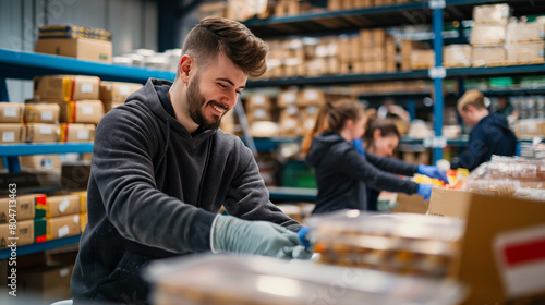 Team members volunteering together at a local food bank, sorting donations and packing food parcels for those in need. Stimulus and inspiration, respect and support, friendship and