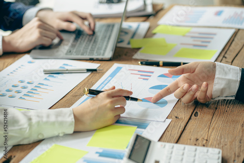 Team of business people meeting to analyze and find information, charts, financial reports, brainstorming, analyzing with consultants, accountants, finance, office teamwork concept.