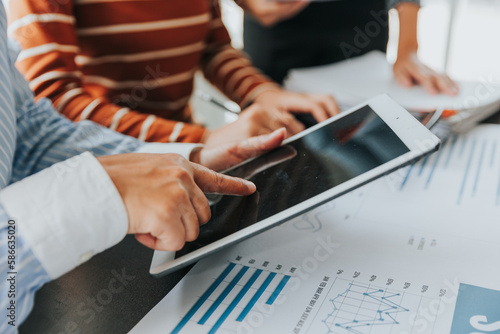Team of business people meeting to explain financial graph data and marketing plan Group of business people at a meeting assessing the status of business investment and marketing