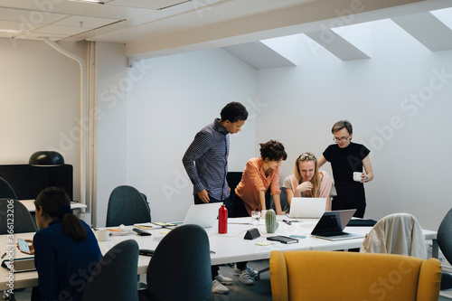 Team of business professionals discussing over laptop in board room during meeting