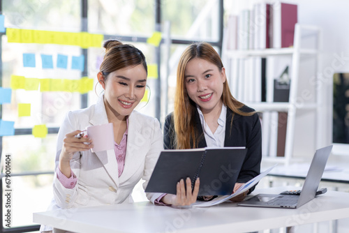 Team of confident asian business women point to graphs and charts to analyze market data, balance sheet, account, net profit to plan new sales strategies to increase production capacity.
