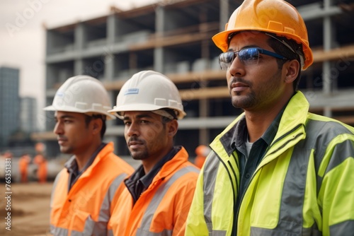 Team of construction workers, engineers or architects wearing hat and safety suit at construction building site