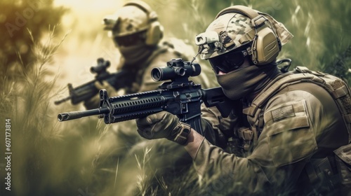 Team of elite special forces soldiers executing a covert mission behind enemy lines, showcasing their tactical skills, advanced weaponry, and stealthy maneuvers