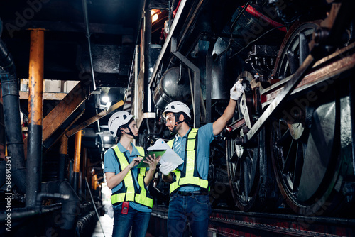 Team of engineer railway wearing safety uniform and helmet under checking under train ,wheels and control system for safety travel passenger. Maintenance cycle concept.