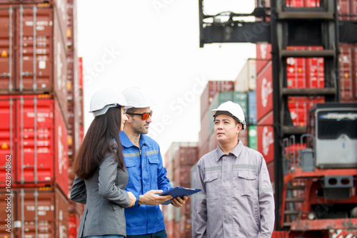 Team of engineers or workers at a container yard discussing seriously and shaking hands to symbolize teamwork and business success.