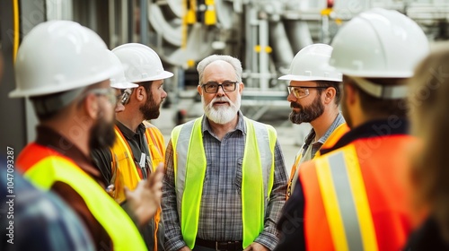 Team of engineers wearing safety vests and hard hats having a meeting in an industrial setting