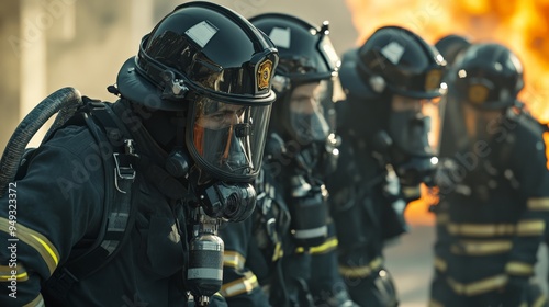 Team of firefighters in full gear and masks, working to contain a blaze. Intense and heroic rescue scene with flames in the background.