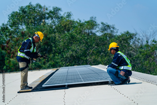 team of professionals installs solar panels, ensuring energy efficiency and sustainable development. The image represents green energy, eco-conscious solutions, and future solar power technology.