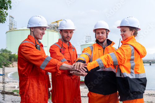 Team of workers showing solidarity by joining hands at an industrial site near water during an overcast day