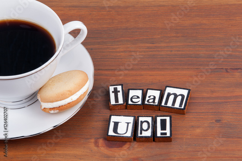 Team Up! On wooden table coffee mug, cookie