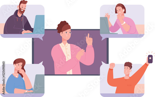Team video call. Screen with people in chat windows