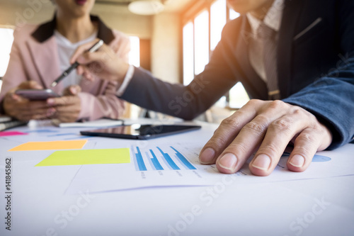 Team work process. young business managers crew working with new startup project. labtop on wood table, typing keyboard, texting message, analyse graph plans.
