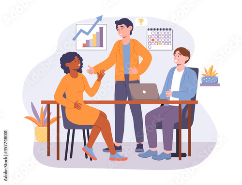Team Work Success concept. Men and women sit in office and discuss company development strategies. Employees at meeting. Cartoon contemporary flat vector illustration isolated on white background