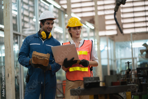 Team Worker factory concept. Inspection technician, factory engineer, inspection of the machine condition in the factory. Inspection by technicians, industrial business, production machinery