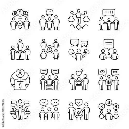 Teamwork and collaboration icon set. Vector line art illustrations of people, speech bubbles, symbols, hearts, checkmarks, and other communication and partnership elements. Simple black and white desi