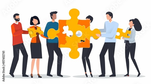 Teamwork and team building flat vector illustration Coworkers assembling jigsaw puzzle cartoon characters Coworking and business partnership concept Businessmen and businesswomen cooperation,