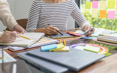 Teamwork brainstorming Creative idea Business project. Business People meeting taking notes while discussing with Color swatch samples to share idea