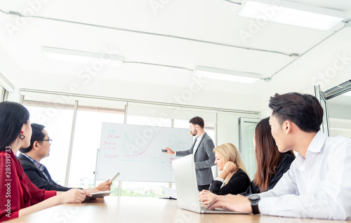Teamwork business concept .Start up business people in modern office, working together having success. Multi ethnic start-up business team on meeting in modern bright office interior brainstorming .