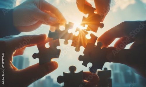 "Teamwork Concept: Hands Holding Jigsaw Puzzle Pieces with Urban Background"
