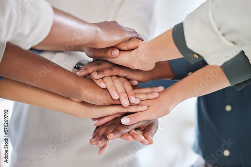 Teamwork, diversity and team stack of hands for celebration, motivation or partnership in office. Multiracial, collaboration and business people celebrating together for success, achievement or goal.