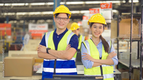 Teamwork group of Asian man worker working in large warehouse retail store industry factory. Rack of stock storage. Cargo in ecommerce and logistic concept. Depot. People lifestyle. Shipment service.