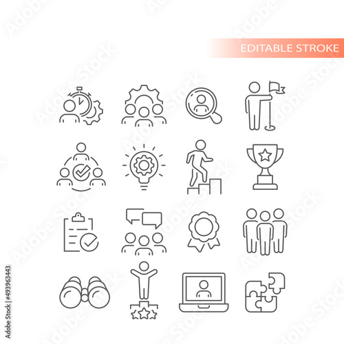 Teamwork, human resources line icon set. Business management, employees achievement outlined icons.