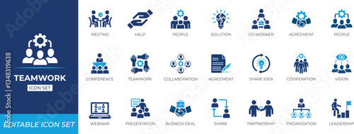 Teamwork icon set with collaboration, group, achievement, assistance, brainstorm, collaboration, and partnership symbols for business, contract, cooperation, goal, and corporate design projects.