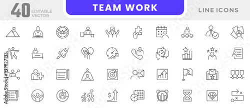 Teamwork line icon collection. Businessman, team, recruitment, leadership, agreement, success, leader, meeting, goal, vision, and group work icon set. UI outline icon pack