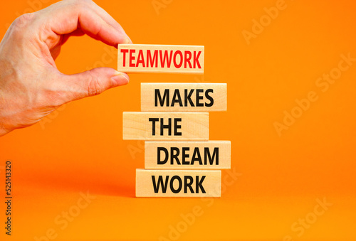Teamwork makes dream work symbol. Concept words Teamwork makes the dream work on wooden blocks on beautiful orange background. Businessman hand. Business Teamwork makes dream work concept. Copy space.