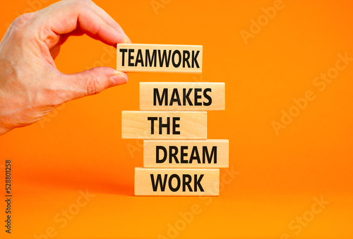 Teamwork makes dream work symbol. Concept words Teamwork makes the dream work on wooden blocks on beautiful orange background. Businessman hand. Business Teamwork makes dream work concept. Copy space.