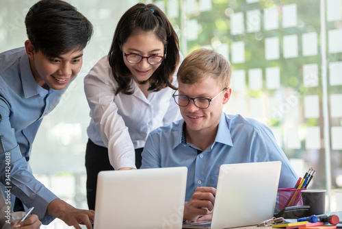 Teamwork of Asian business people discussing documents and plan financial graph analysis in the meeting room.