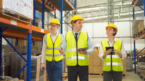 Teamwork of workers working in large warehouse retail store industry.Rack of stock storage. Interior of cargo in ecommerce and logistic concept. Depot. People lifestyle. Shipment service for container