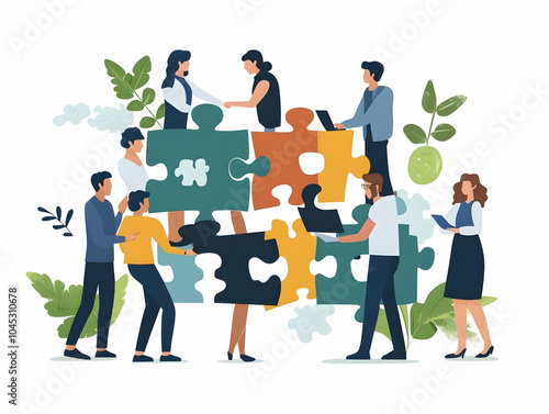 Teamwork Problem Solving Diverse Businesspeople Assembling Puzzle Pieces Unity Collaboration Medium Shot Hands Isolated White Background Clean Copy Space Simple Flat Vector Illustration Smart Business