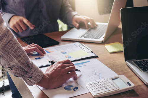 Teamwork process, Business team two managers colleagues discussing and analysis new plan financial graph data and marketing documents report on office table with laptop and digital tablet