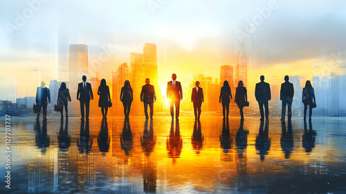 Teamwork: Professionals Strive for Success in Cityscape at Sunrise