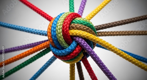 Teamwork strength shows with colorful ropes knotted together in a vibrant display of collaboration