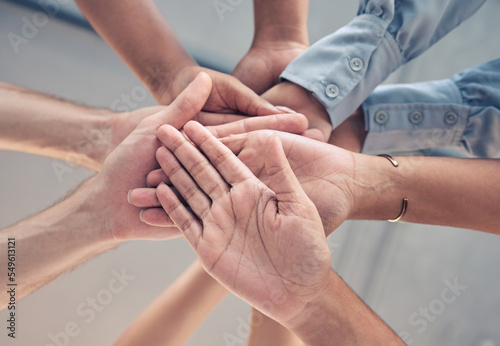 Teamwork, support and stack of business people hands working together in corporate office. Community, trust and close up of hand of workers in circle for collaboration, motivation and team building