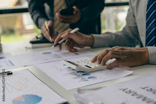 Teamwork with business people analyzing cost graphs on a table at a business conference room and office workers working with project planning documents on a conference table, close-up photography