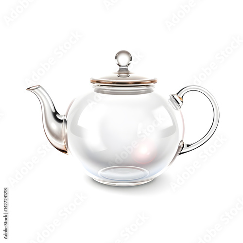 Teapot – A 3D glass teapot, elegant round shape, glossy and transparent, delicate handle and spout, soft light refractions, white background, icon illustration. Generative AI