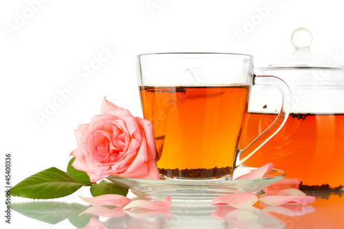 teapot and cup of tea with rose isolated on white