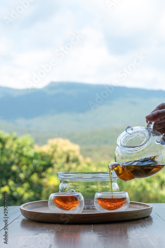 teapot pouring tea into cup with mountain lanscapes background.