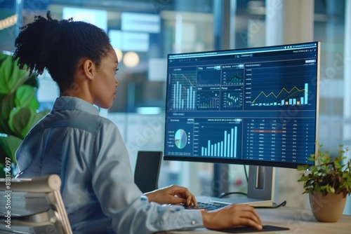 Tech Analyst Monitoring KPIs on Office Screen